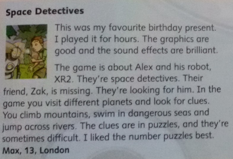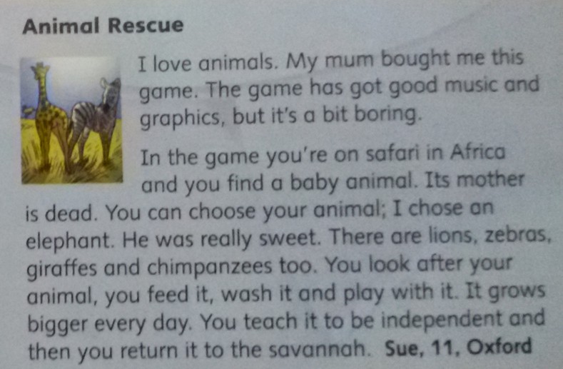 Inicio Cuestionario SCORM Pregunta COMPUTER GAME 1 1 When did he have this computer game? Respuestas Opción 1 A. He had it in his birthday. Opción 2 B. He played it for hours. Opción 3 C. It was his favourite present. Opción 4 D. The graphics are good. Pregunta 2. What was this computer game about? Respuestas Opción 1 A. Their friends was Zak. Opción 2 B. They were looking for him. Opción 3 C. It was about space detectives. Opción 4 D. The robot's name was XR2. Pregunta 3. Where did you go in the game? Respuestas Opción 1 A. You looked for clues. Opción 2 B. You visited different planets. Opción 3 C. You climbed dangerous seas. Opción 4 D. You swam mountains. Pregunta 4. How were the puzzles? Respuestas Opción 1 A. The clues were in puzzles. Opción 2 B. The puzzles were always very easy. Opción 3 C. He liked the number puzzles best. Opción 4 D. The puzzles were often easy. Pregunta COMPUTER GAME 25. Who gave Sara this game? Respuestas Opción 1 A. She loved animals. Opción 2 B. Her mother bought her this game. Opción 3 C. The game had got good music. Opción 4 D. It was a bit boring. Pregunta 6. Where were you in the game? Respuestas Opción 1 A. You were on a safari in Africa. Opción 2 B. You found a baby animal. Opción 3 C. Its mother was dead. Opción 4 D. You chose your animal. Pregunta 7. How did you look after your animal? Respuestas Opción 1 A. She chose an elephant. Opción 2 B. It was really sweet. Opción 3 C. There were lions, zebras, giraffes and chimpanzees. Opción 4 D. You fed it, washed it and play with it. Pregunta 8. How old was Sue? Respuestas Opción 1 A. She was twelve years old. Opción 2 B. She lived in Oxford. Opción 3 C. She was eleven years old. Opción 4 D. She was very old. Habilitar JavaScript
