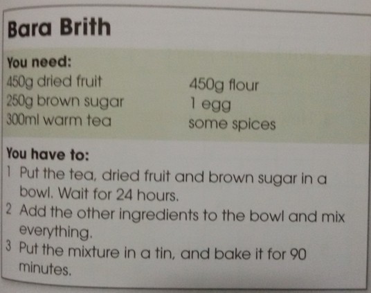 Inicio Cuestionario SCORM Pregunta 1 What is Bara Brith? Respuestas Opción 1 A. It's some meat. Opción 2 B. It's salad. Opción 3 C. It's a special bread. Opción 4 D. It's a chocolate cake. Pregunta 2. Where is Bara Brith from? Respuestas Opción 1 A. It's from Spain. Opción 2 B. It's from France. Opción 3 C. It's from Morocco. Opción 4 D. It's from Wales. Pregunta 3. How many ingredients do you need? Respuestas Opción 1 A. I need 450 ingredients. Opción 2 B. I need 6 ingredients. Opción 3 C. I need 250 ingredients. Opción 4 D. I need 300 ingredients. Pregunta 4. What two ingredients do you need 450 grams? Respuestas Opción 1 A. Dried fruits and flour. Opción 2 B. Brown sugar and eggs. Opción 3 C. Warm tea and spices. Opción 4 D. Dried fruit and brown sugar. Pregunta 5. How much tea do you need? Respuestas Opción 1 A. I need 450g. Opción 2 B. I need 250g. Opción 3 C. I need 300g. Opción 4 D. I need 300ml. Pregunta 6. How much brown sugar do you need? Respuestas Opción 1 A. Two hundred and fifteen grams. Opción 2 B. Two hundred and fifty grams. Opción 3 C. Two thousand and fifteen grams. Opción 4 D. Two thousand and fifty grams. Pregunta 7. How long do you have to wait first? Respuestas Opción 1 A. I have to wait 90 minutes. Opción 2 B. I have to wait 1 hour. Opción 3 C. I have to wait 1 day. Opción 4 D. I have to wait 20 hours. Pregunta 8. Where do you have to put the ingredients first? Respuestas Opción 1 A. I have to put them in a plate. Opción 2 B. I have to put them in a bowl. Opción 3 C. I have to put them in the fridge. Opción 4 D. I have to put them in fire. Pregunta 9. What do you have to do second? Respuestas Opción 1 A. Mix every ingredients. Opción 2 B. Chop every ingredients. Opción 3 C. Bake every ingredients. Opción 4 D. Put them in a tin. Pregunta 10. How long do you have to bake it for? Respuestas Opción 1 A. 1 hour and 15 minutes. Opción 2 B. 2 hours and 30 minutes. Opción 3 C. 1 hour and 30 minutes. Opción 4 D. 2 hours and 10 minutes. Habilitar JavaScript