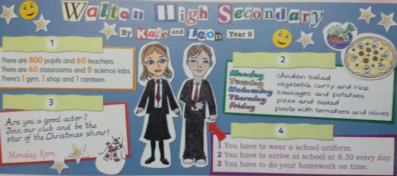 Inicio Ficheros adjuntos (Ventana nueva) Cuestionario SCORM Pregunta Look at the poster, read the sentences and choose True or False. 1) Walton is a Primary School. Respuestas Opción 1 It's true. Opción 2 It's false. Pregunta 2) Kate and Leon made this poster. Respuestas Opción 1 It's true. Opción 2 It's false. Pregunta 3) There are eight hundred students. Respuestas Opción 1 It's true. Opción 2 It's false. Pregunta 4) They have P.E. lessons in their clasrooms. Respuestas Opción 1 It's true. Opción 2 It's false. Pregunta 5) They can buy pencils and notebooks in the shop. Respuestas Opción 1 It's true. Opción 2 It's false. Pregunta 6) They have salad and pizza on Thursdays. Respuestas Opción 1 It's true. Opción 2 It's false. Pregunta 7) They have a club to prepare a Christmas show. Respuestas Opción 1 It's true. Opción 2 It's false. Pregunta 8) They don't have to wear a school uniform. Respuestas Opción 1 It's true. Opción 2 It's false. Pregunta 9) They have to arrive at school at half past eight. Respuestas Opción 1 It's true. Opción 2 It's false. Pregunta 10) You don't have to do your homework. Respuestas Opción 1 It's true. Opción 2 It's false. Habilitar JavaScript