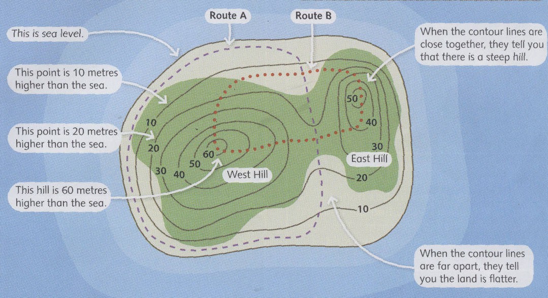 Inicio Ficheros adjuntos (Ventana nueva) Cuestionario SCORM Pregunta USING CONTOUR LINES ON MAPS Read the sentences and choose True or False. 1) Contour lines show the shape of the land. Respuestas Opción 1 It's true. Opción 2 It's false. Pregunta 2) See level is 10 metres high. Respuestas Opción 1 It's true. Opción 2 It's false. Pregunta 3) The numbers of the contour lines show the metres below sea level. Respuestas Opción 1 It's true. Opción 2 It's false. Pregunta 4) There is a steep hill when the contour lines are close together. Respuestas Opción 1 It's true. Opción 2 It's false. Pregunta 5) The land is flatter when the contour lines are far apart. Respuestas Opción 1 It's true. Opción 2 It's false. Pregunta 6) There are three hills in the island. Respuestas Opción 1 It's true. Opción 2 It's false. Pregunta 7) The East Hill is 60 metres high. Respuestas Opción 1 It's true. Opción 2 It's false. Pregunta 8) The West Hill is higher than the East Hill. Respuestas Opción 1 It's true. Opción 2 It's false. Pregunta 9) The route B is the most difficult. Respuestas Opción 1 It's true. Opción 2 It's false. Pregunta 10) The route A is the longest. Respuestas Opción 1 It's true. Opción 2 It's false. Habilitar JavaScript