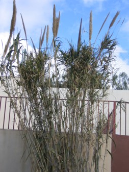 ARUNDO DÓNAX. Nombre vulgar: Caña común Familia: Poaceae. Herbácea de gran tamaño, con tallos que desarrollan cañas a partir de un grueso rizoma, con hojas alternas, sin pecíolo con una base que rodea al tallo y